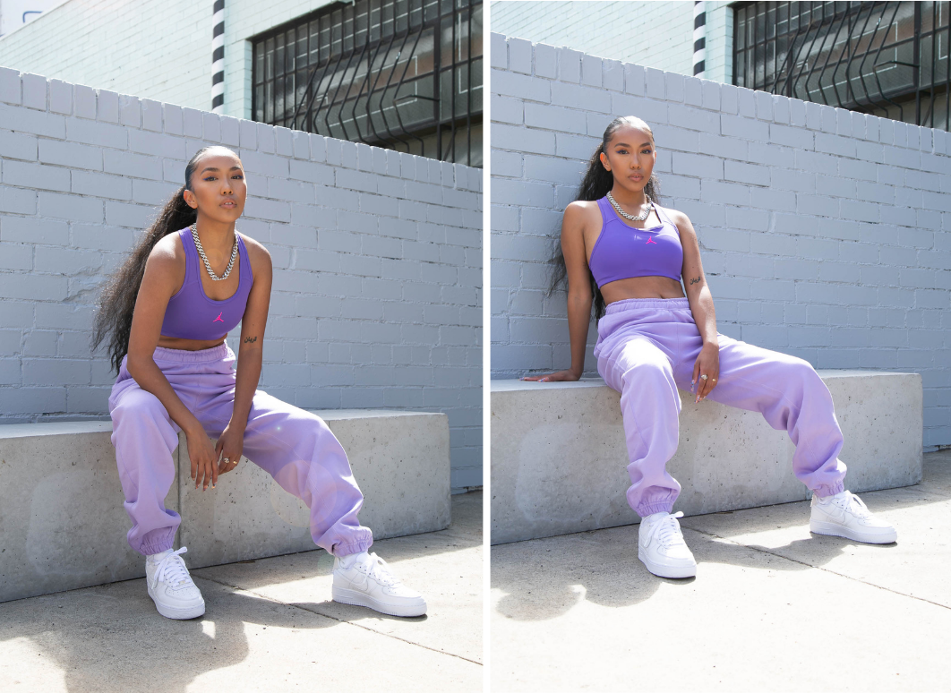 Olivia wears the Jordan Jumpman Sports Bra with the NikeLab Solo Swoosh Track Pants and Air Force 1 '07 Craft from Sole Finess.